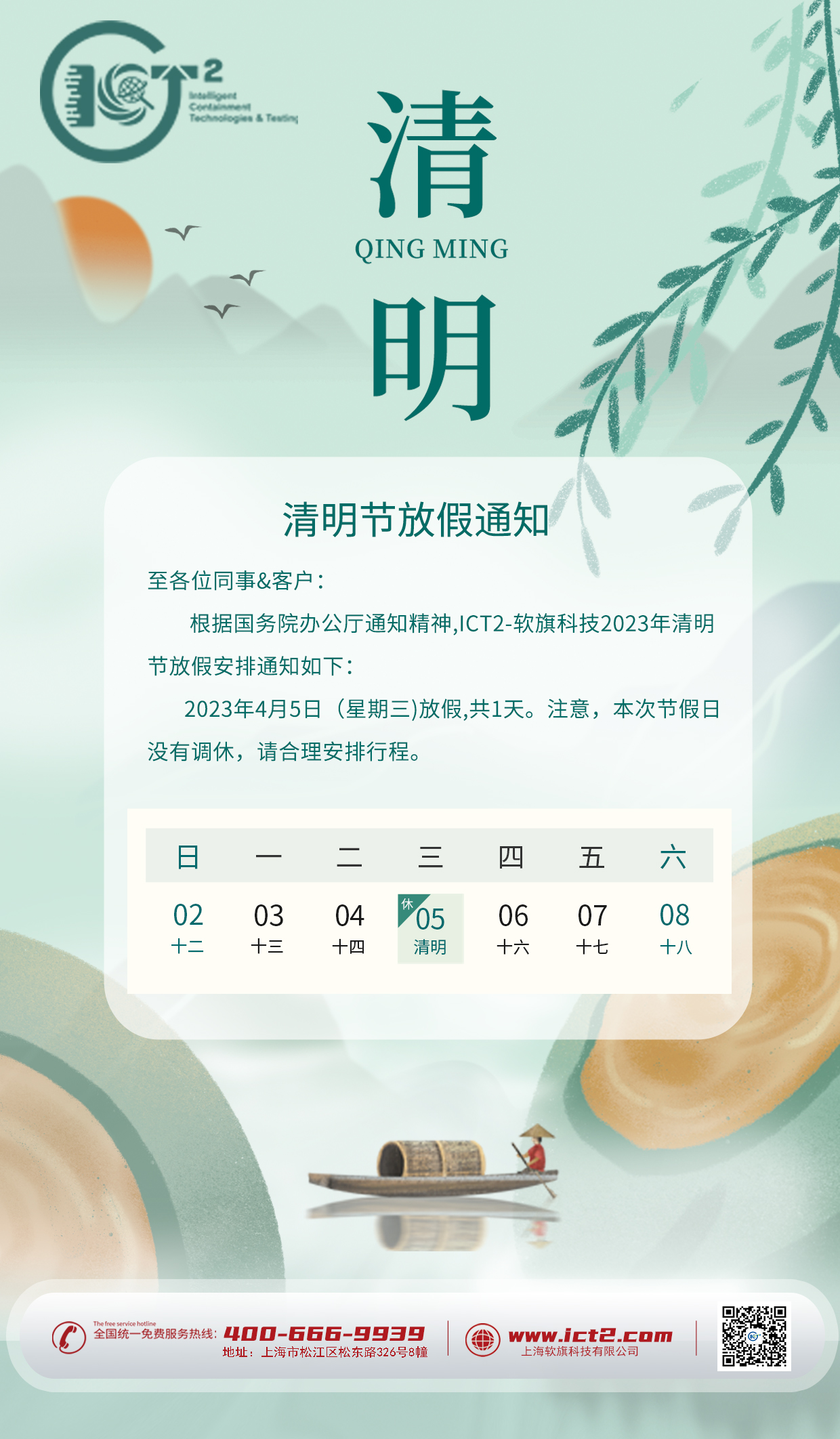 根据国务院办公厅通知精神,ICT2-软旗科技2023年清明节放假安排通知如下: