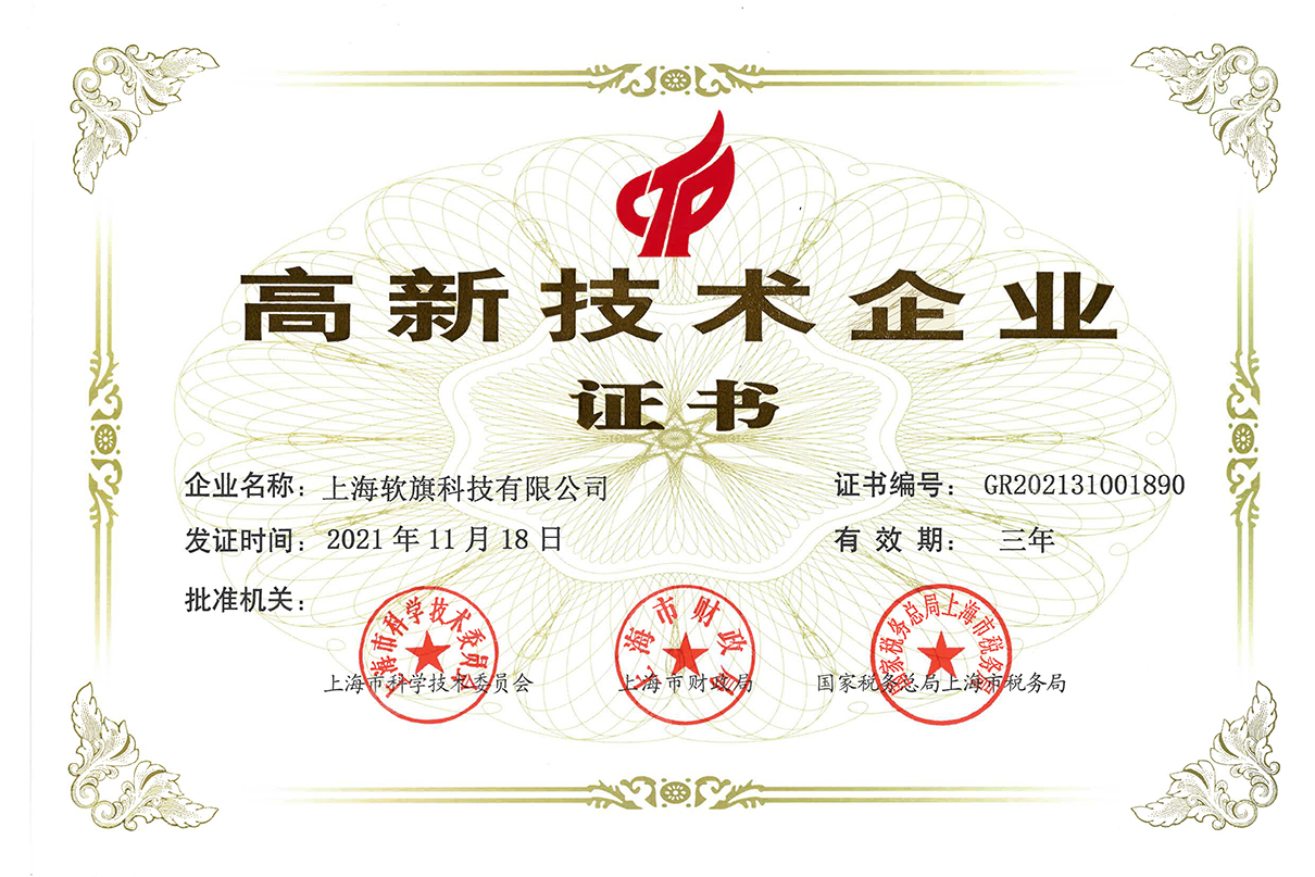 2021年度上海市高新技术企业的认定管理工作将依据《高新技术企业认定管理办法》(国科发火〔2016〕32号,以下简称《认定办法》)、《高新技术企业认定管理工作指引》(国科发火〔2016〕195号,以下简称《工作指引》)、《上海市高新技术企业认定实施办法》(沪科合〔2016〕22号)等相关文件。上海软旗科技有限公司(以下称ICT2)认定通过上海市高新技术企业,获科学技术部火炬高技术产业开发中心备案。