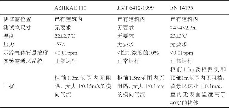 由表 1 可以得出,这个部分的差别主要集中在测试室尺寸、温度、压力、示踪气体背景浓度和避免干扰的要求上。在排风柜的测试中,测试室尺寸主要会对污染物浓度的测试结果和操作面上的气流组织形式产生影响。测试室尺寸过小的影响有两方面,第一,会使实验室通风系统的送风口过于靠近排风柜的操作面,其送风气流速度过大,无法满足上面所提到的基本测试条件,结果会影响到排风柜对污染物的控制[5]; 第二,因为示踪气体的发生量是一定的,测试室的尺寸过小就意味着室内示踪气体的浓度会偏大,难以满足测试的最终要求。反之,如果测试室尺寸过大,会造成浓度测量结果偏小,形成一种假象,认为该排风柜对污染物的控制十分有效。