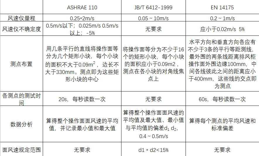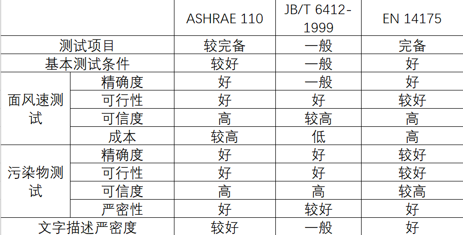 尽管部分测试项目相同,如面风速测试和污染物控制浓度测试,但是在各部标准中规定的测试要求也不尽相同。下面对各个测试方法进行比较和评价。