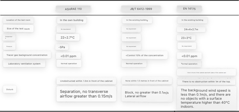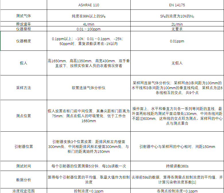 The test of the tracer gas concentration is the focus of each standard, and it is also where the difference is greatest. The tracer gas test part of JB/T 6412-1999 is quoted from ASHRAE 110, but only the most basic test items are retained, so this part of JB/T 6412-1999 is not covered separately in the following description. Table 3 compares the basic concentration test in ASHRAE 110 with the inner plane test in EN14175. (The so-called internal test plane refers to the operating plane of the exhaust cabinet, that is, a plane with the horizontal edge on both sides of the opening of the door and the vertical edge on the inner wall of the exhaust cabinet.)