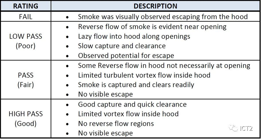 Smoke visualization uses visible smoke to display the movement form of air flow in the fume hood and whether there is smoke overflow. Ashrae110-2016 contains two tests: small smoke visualization test and large smoke visualization test. The smoke visualization test method has the advantages of simple operation and intuitive results, but the tester has strong subjectivity in the test process. In order to make the smoke test results more referential, we can make a quantitative evaluation of the smoke test artificially. The following table: