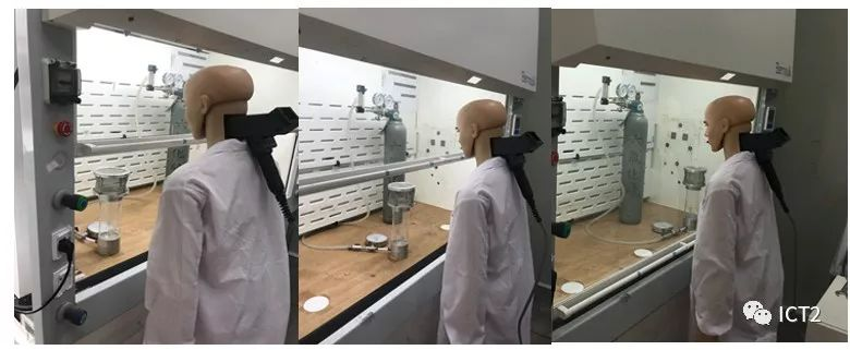 The first test is the tracer gas test. Place the releaser and dummy at the left, middle and right positions respectively. The sampling port of SF6 tracer gas analyzer is located at the mouth. The tracer gas is released for 5 minutes of test and data recording.