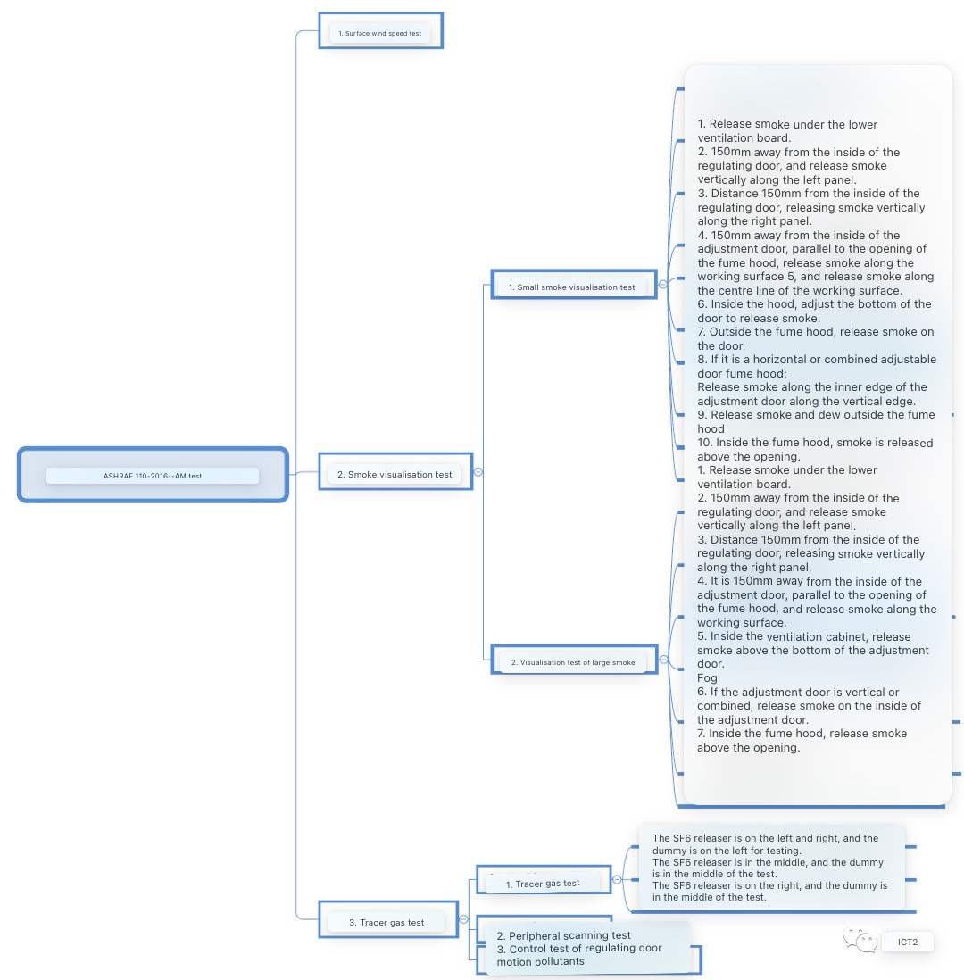 According to ASHRAE 110-2016 standard, am test includes three types of tests: surface wind speed test, smoke visualization test and tracer gas test. The following figure is an overview of am testing.