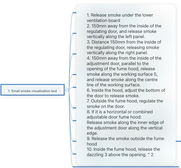 In ASHRAE 110-2016, the small smoke test includes 10 small tests, which mainly detect the gas flow pattern and overflow inside and outside the lower ventilation panel, working face, left and right panels, deflector, regulating door and fume hood. The detailed test is shown in the figure below: