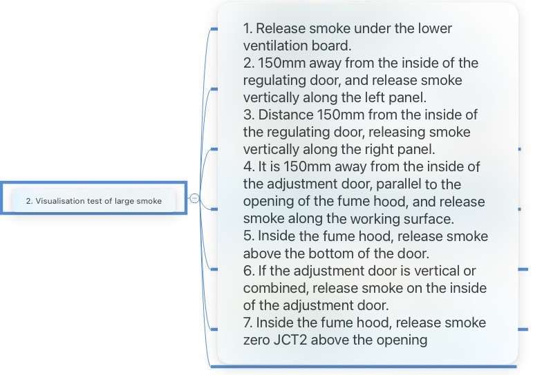 In ASHRAE 110-2016, the large smoke test includes 7 small tests, which mainly detect the gas flow pattern and overflow in the lower ventilation panel, working face, left and right panels, deflector and fume hood. The detailed test is shown in the figure below:
