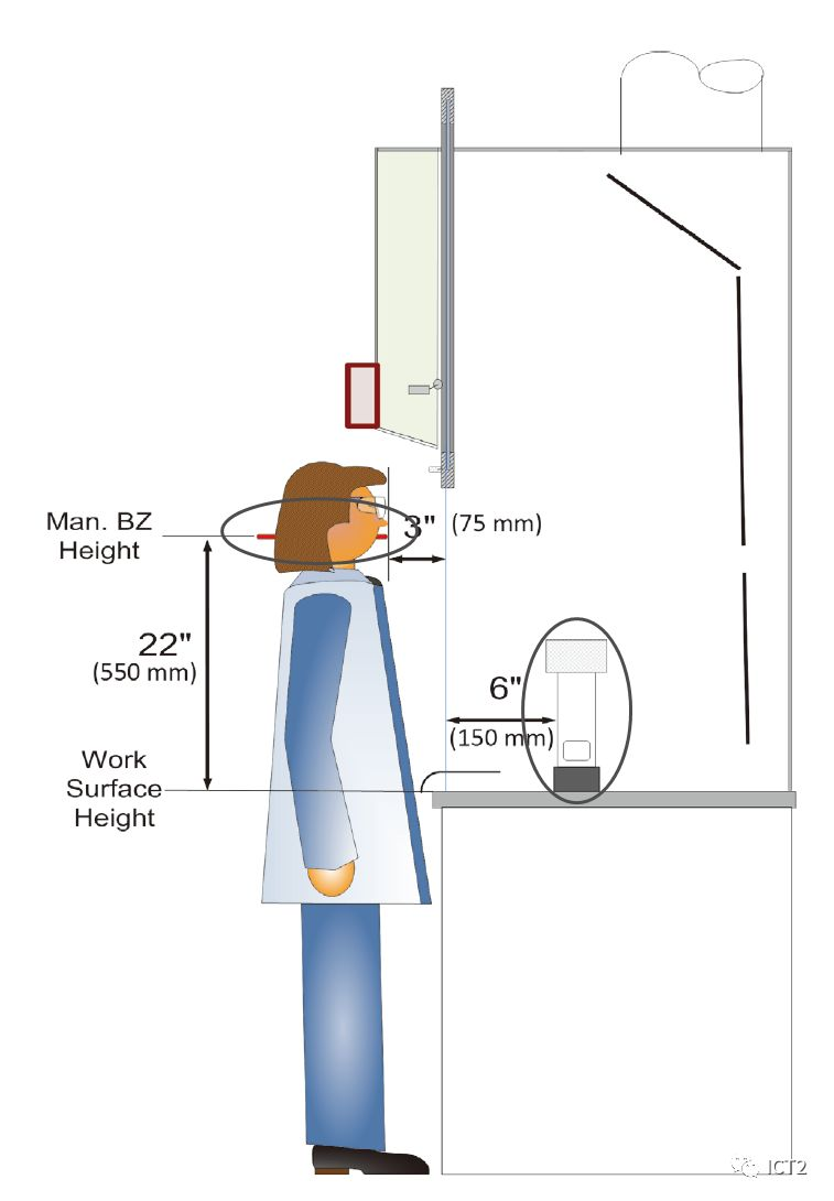 The surface wind speed of the fume hood is measured by the hot air velocimeter and the plane wind speed grid specified in Section 6.2 of the standard. SF6 is released in the fume hood, and the amount entering the breathing area of the dummy is measured by infrared spectrophotometer or ionization technology. The basic setting is shown in the following figure: [2]