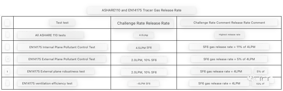 EN14175; Part 3 test uses a 10% sulfur hexafluoride nitrogen mixture with a total release rate of 2 LPM for internal plane test (using a 9-point diffuser sampling array); The rate of external plane and robustness test is 4.5 LPM, and the fume hood exhaust rate flow for ventilation efficiency test is [(5 - 8) / 1000000].