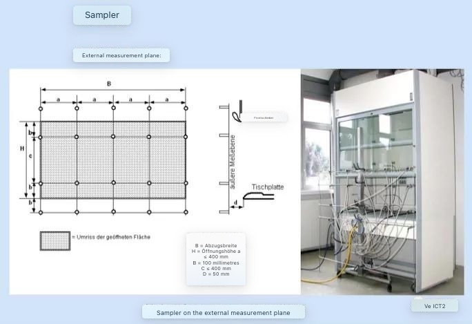 9 internal sampling points and 1 releaser are placed on a device, which is placed at several positions on the plane of the window frame of the fume hood. The releaser (circled) for this test is located in front of the sampling grid on the same component. The sampling port is on the plane of the window frame.