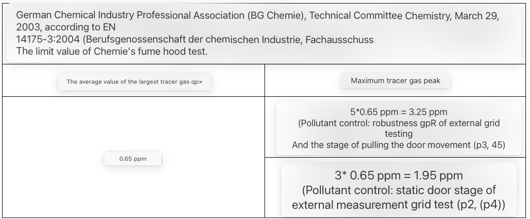 3) The size of the pollutant control factor depends on three values: a) Flow rate of tracer gas; b) Extract the flow rate of the fume hood; c) The average tracer gas concentration inside and outside the fume hood (the latter is the only value in this equation related to the capacity of the fume hood).
