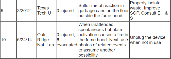 The main percentage of burns and tears in laboratory accidents is significant. Burns and tears are typical in fume hood fires. We can see this from the ten examples cited in the following chart: