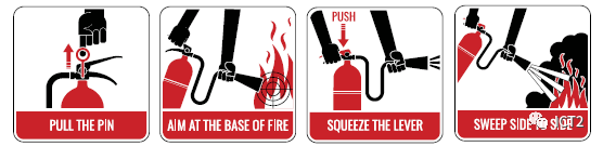 • if the steps listed above are not practical or do not extinguish the fire, a fire extinguisher may be used to extinguish the fire. If you have received training in using fire extinguishers or are otherwise confident in using fire extinguishers, put yourself between the fire and escape routes (such as doors) and put out the fire from this position to ensure that you can escape. Small fires can often be put out, but not always. It's easy to underestimate fire. If not put out, the fire will soon threaten your life.