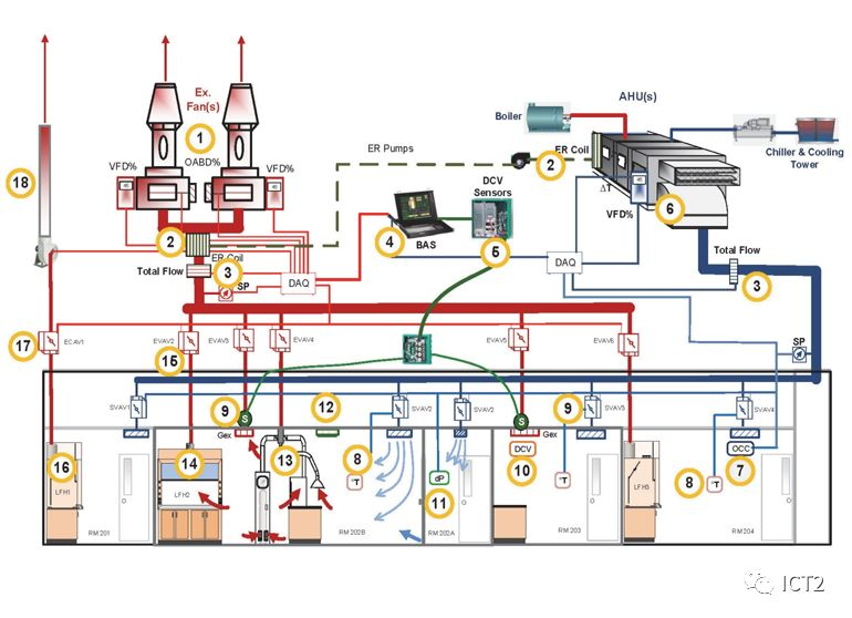 The design, construction, operation and use of lacs will affect the ability to control chemicals in the air, meet safety requirements and meet ventilation requirements. Lacs can be simple, constant volume (CV), independent systems, or complex variable air volume (VAV), which can regulate the air flow in multiple spaces under a series of operation modes. Figure 1 and table 1 depict a complex, modern VAV exhaust and air supply system that can adjust the flow according to the change of ventilation demand.